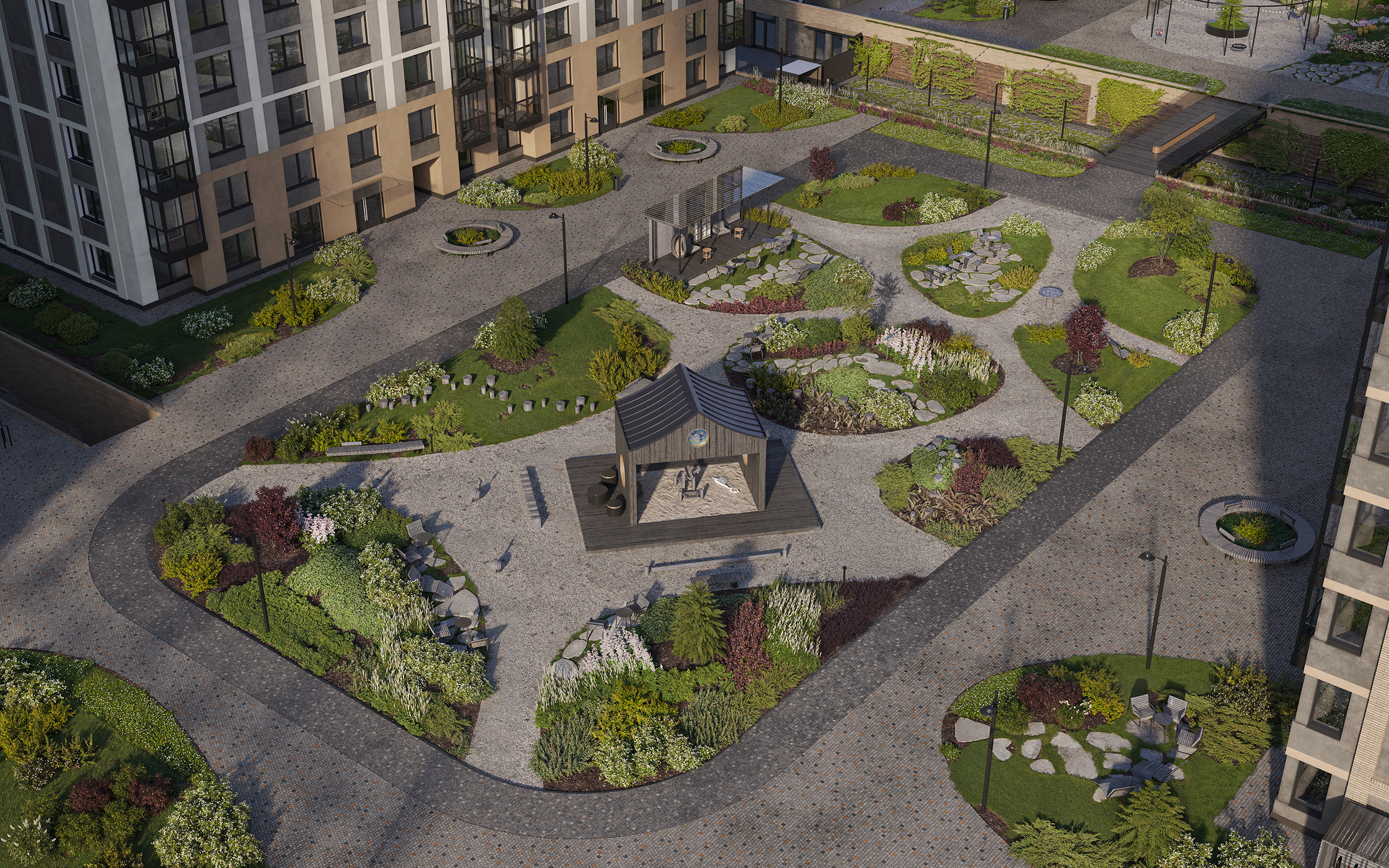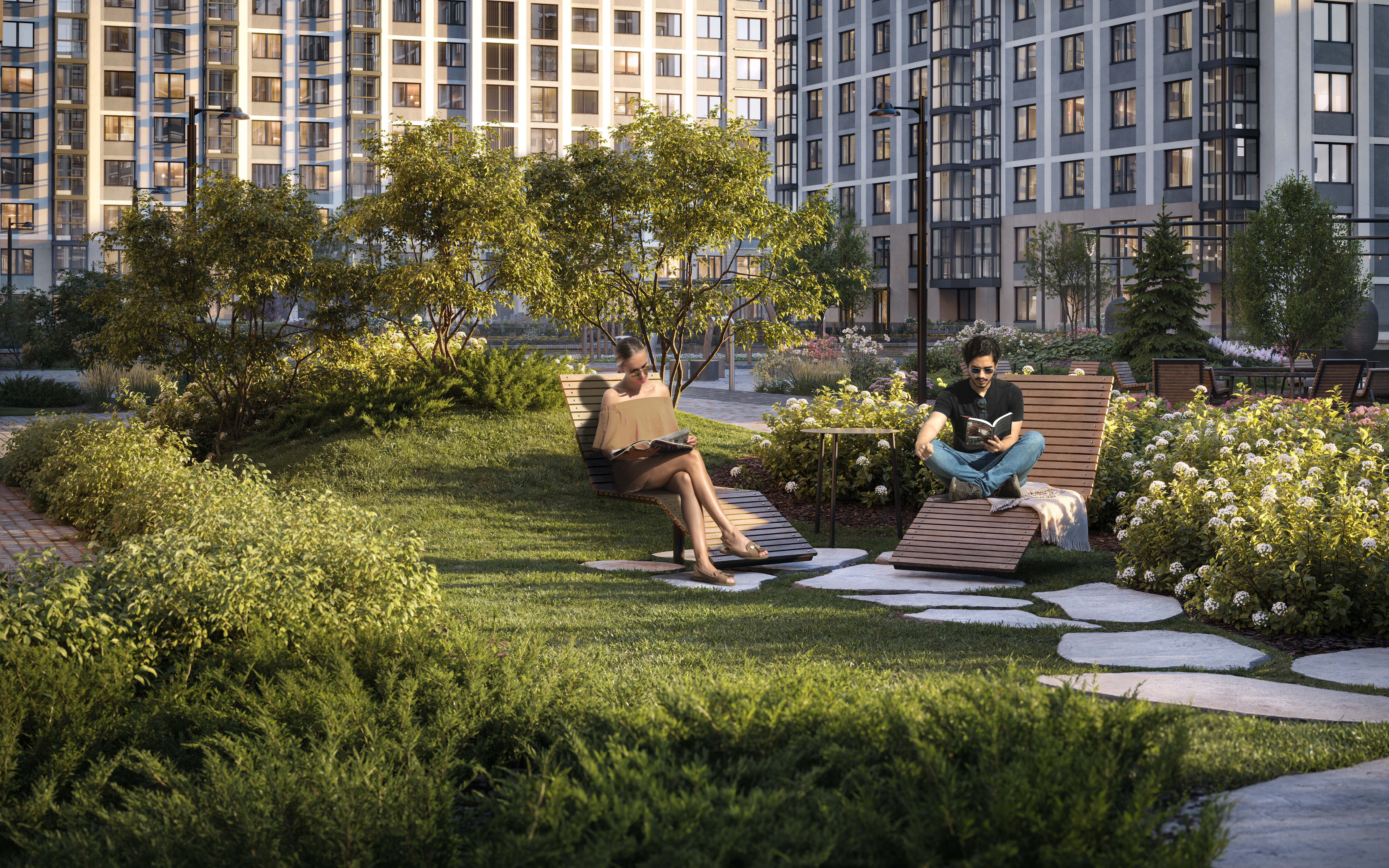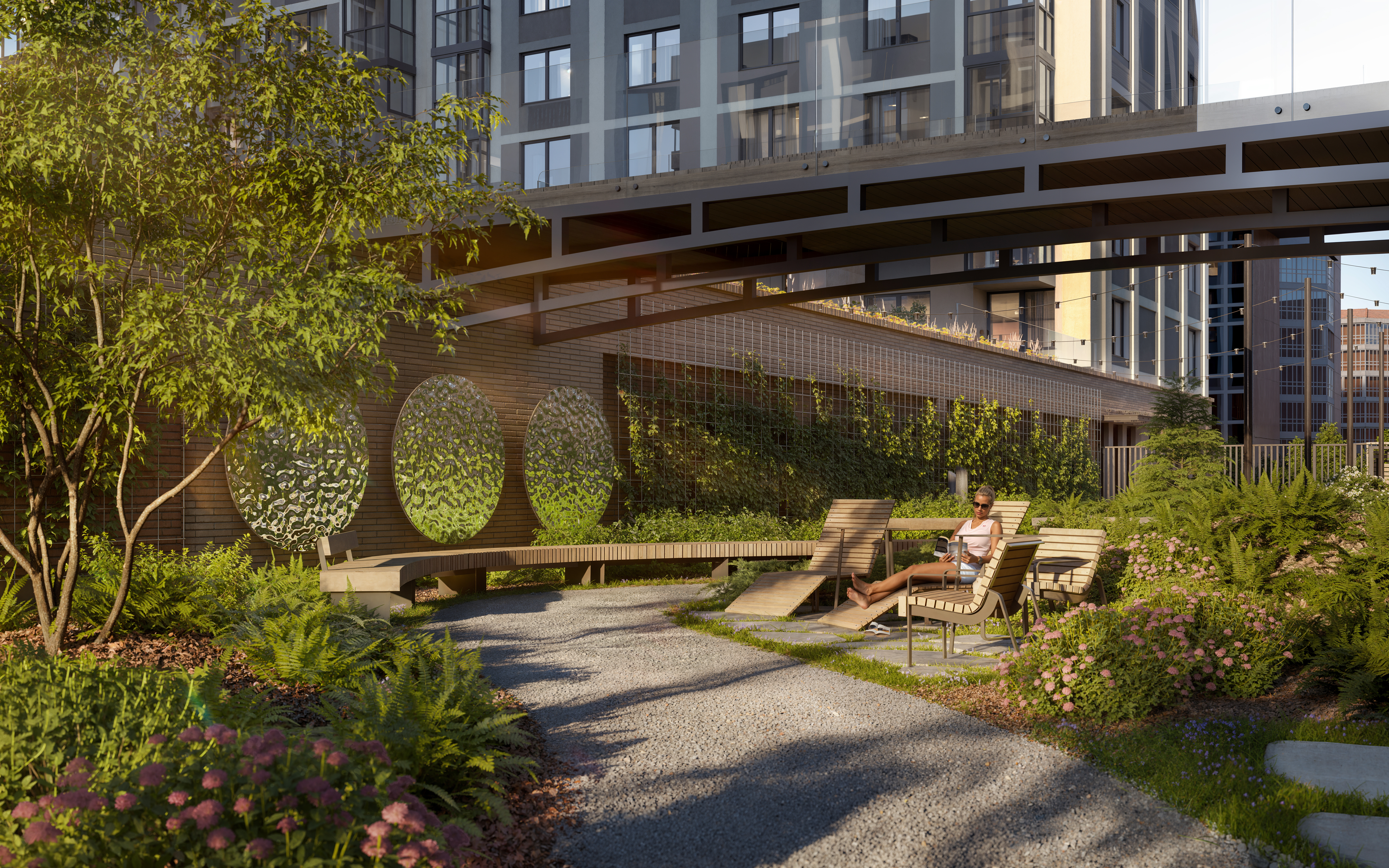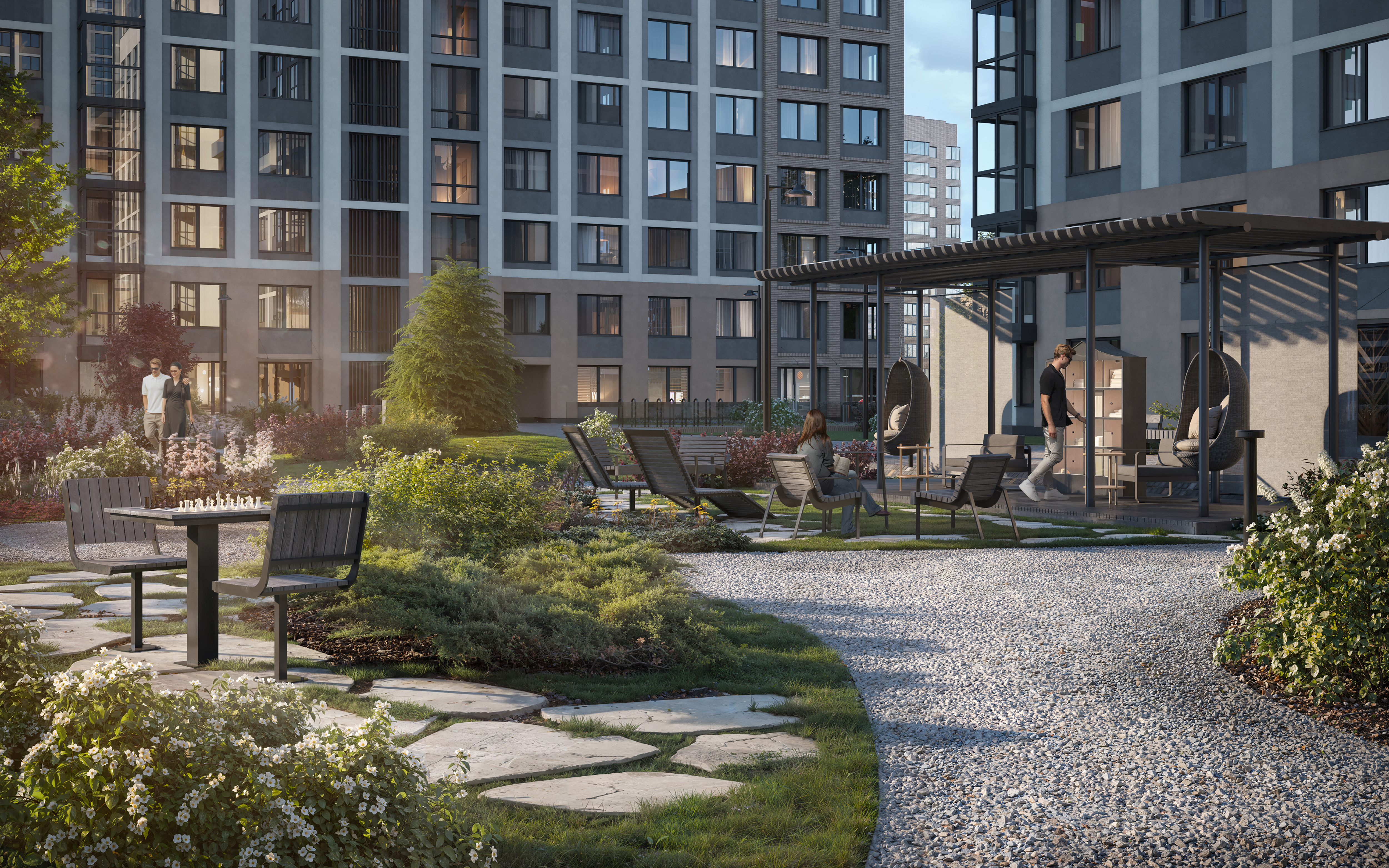 Первый двор - тихое, созидательное место, где можно остаться наедине со своими мыслями, почитать книгу в библио-беседке или помедитировать на лежаке.