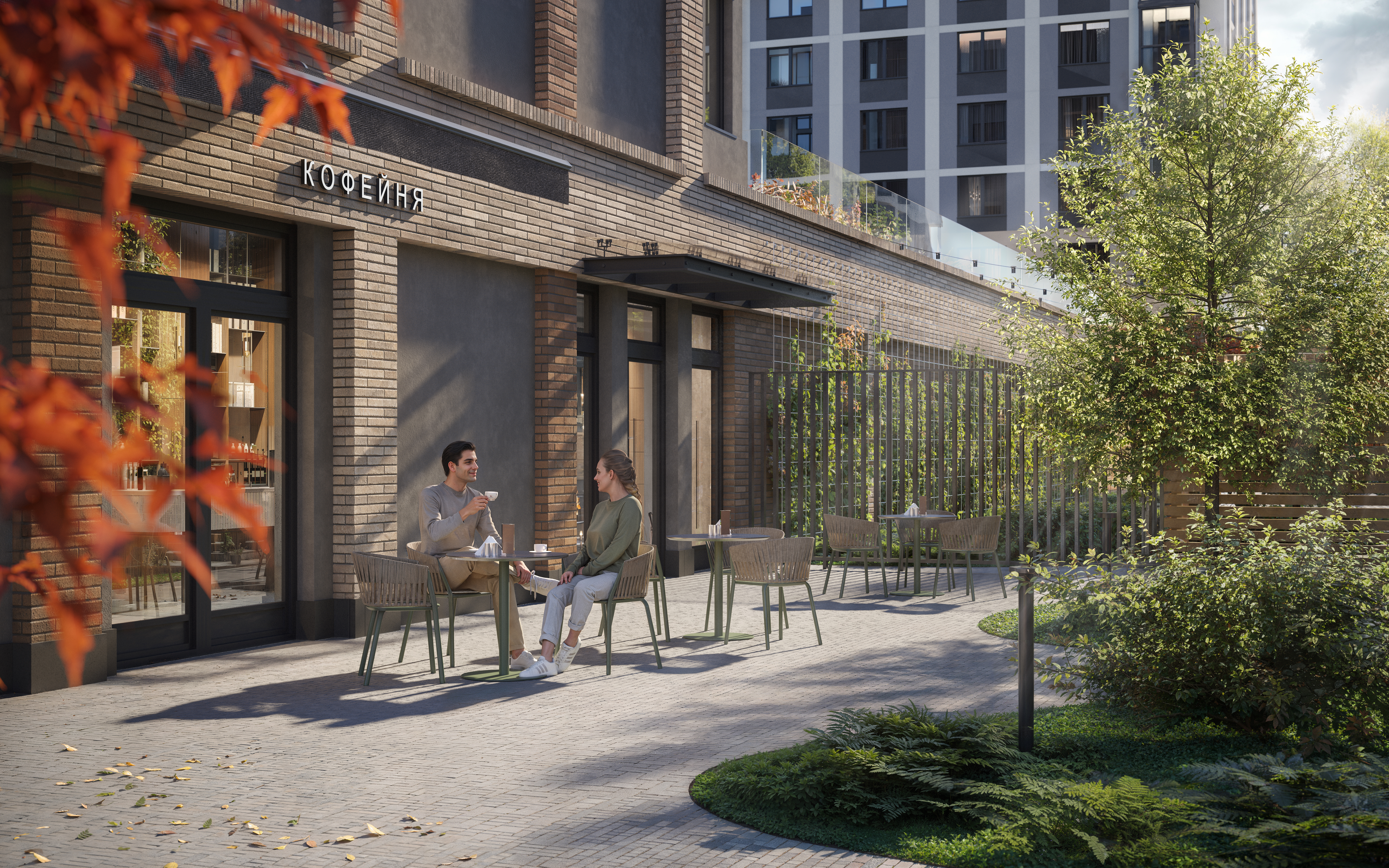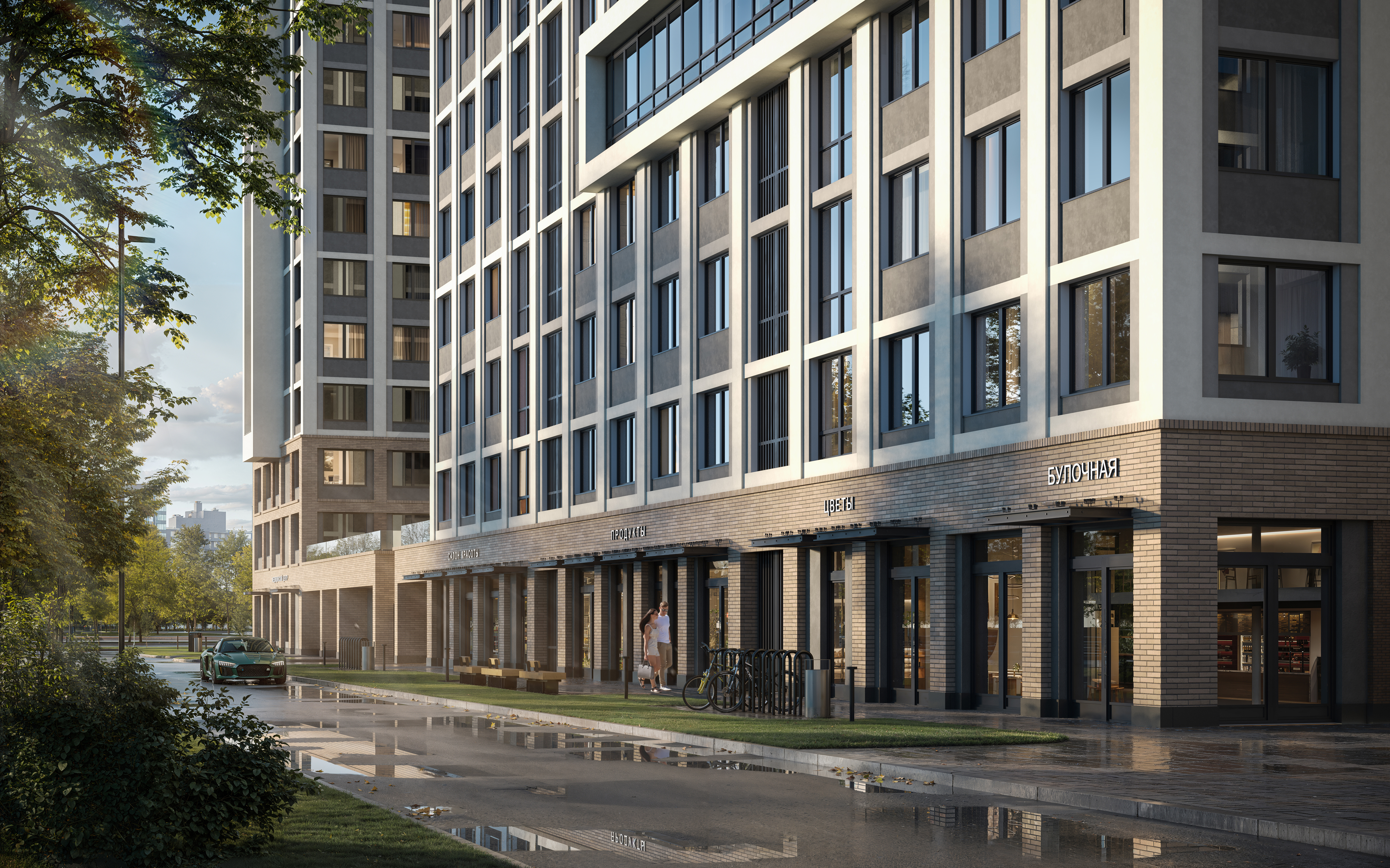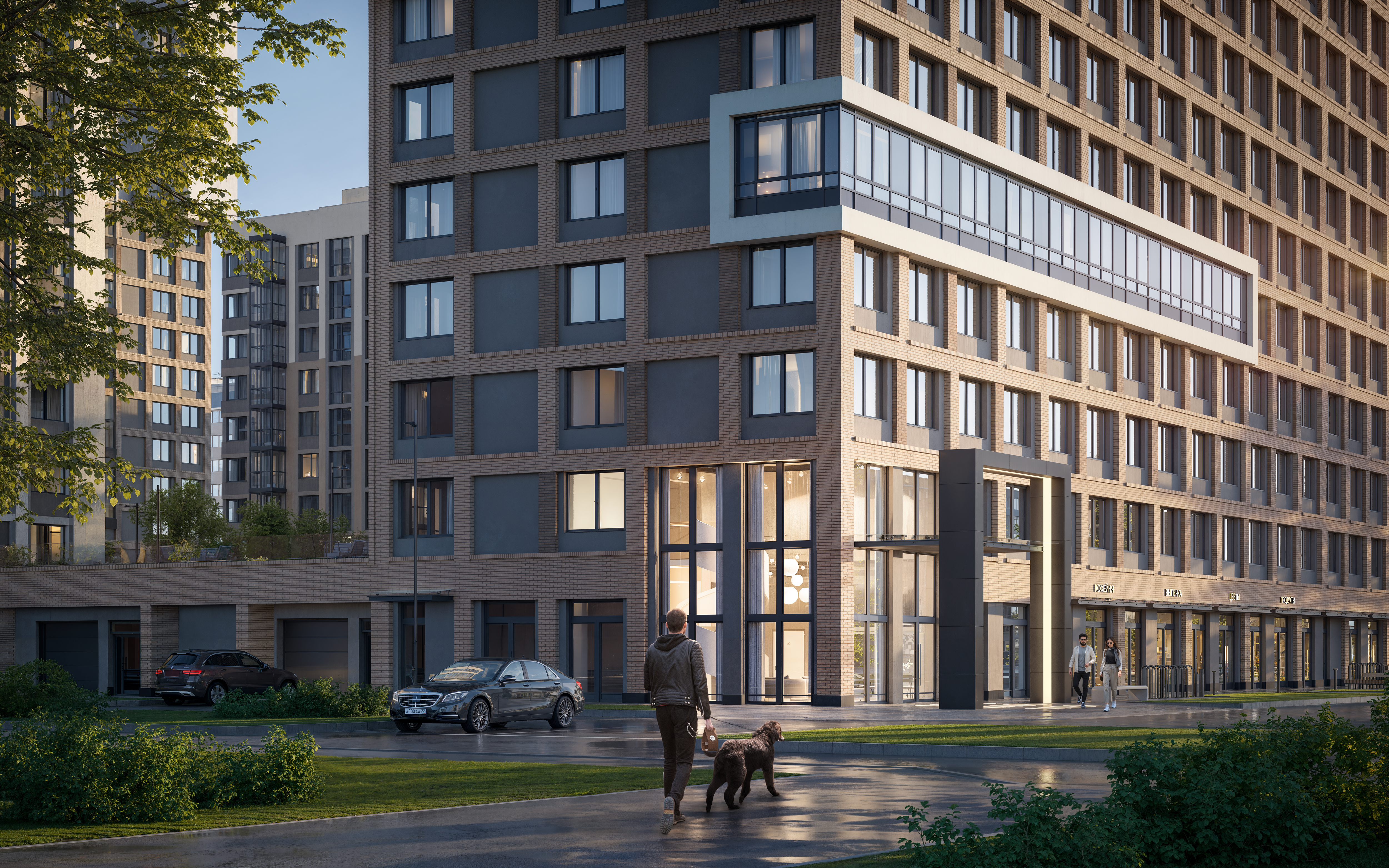 На территории, которая располагается вровень с первыми этажами комплекса, появятся кафе, магазины, парк с пешеходным бульваром.