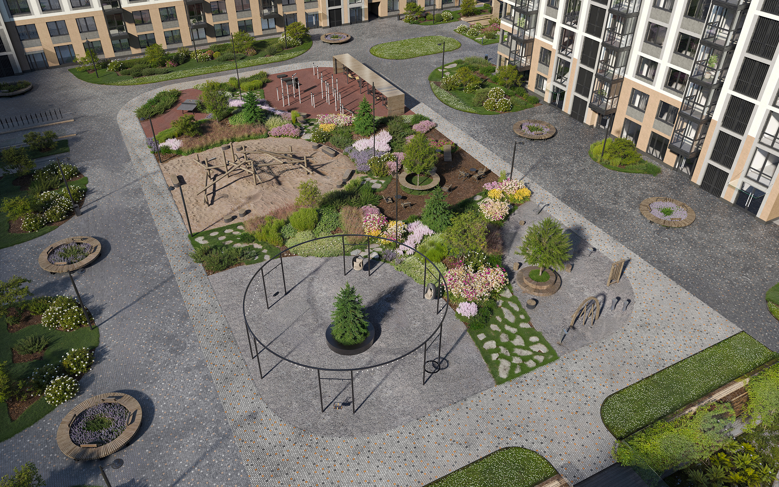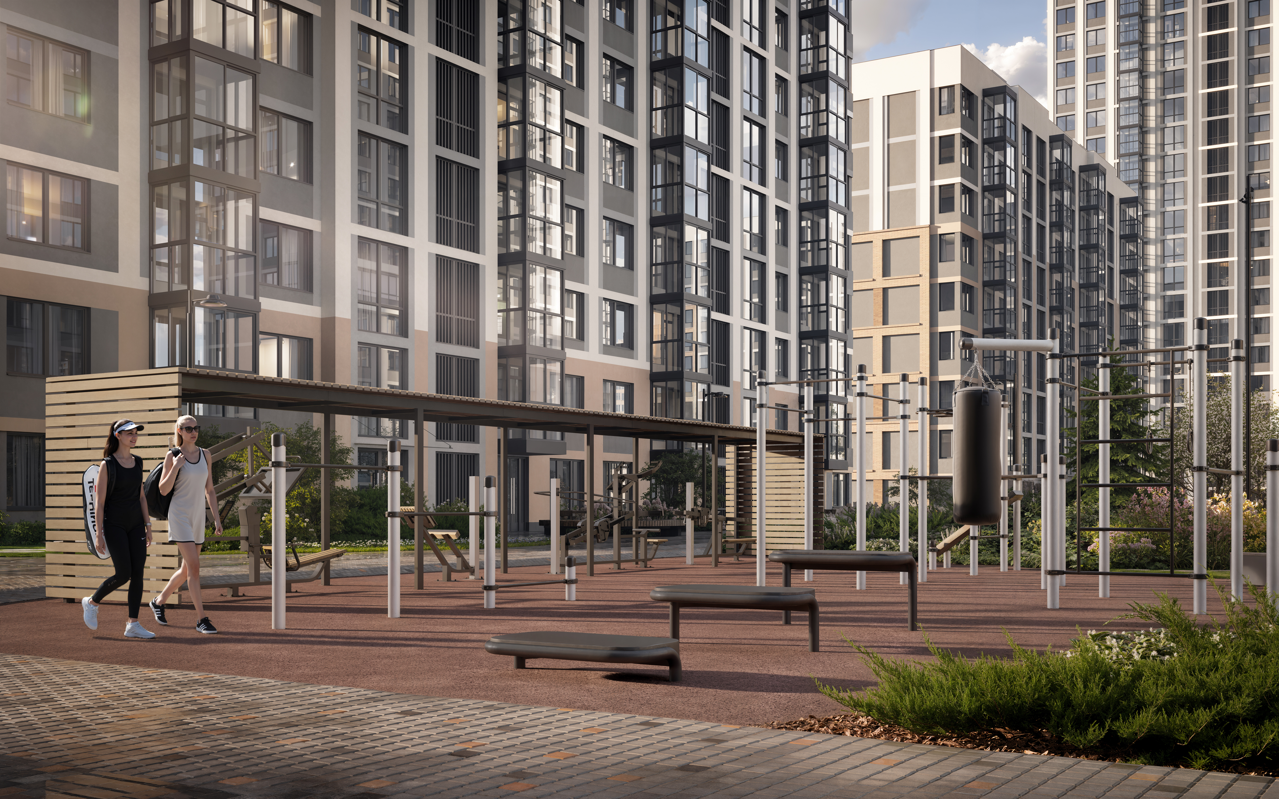 - Большая спортивная площадка оборудована профессиональными уличными тренажёрами и workout-комплексом.