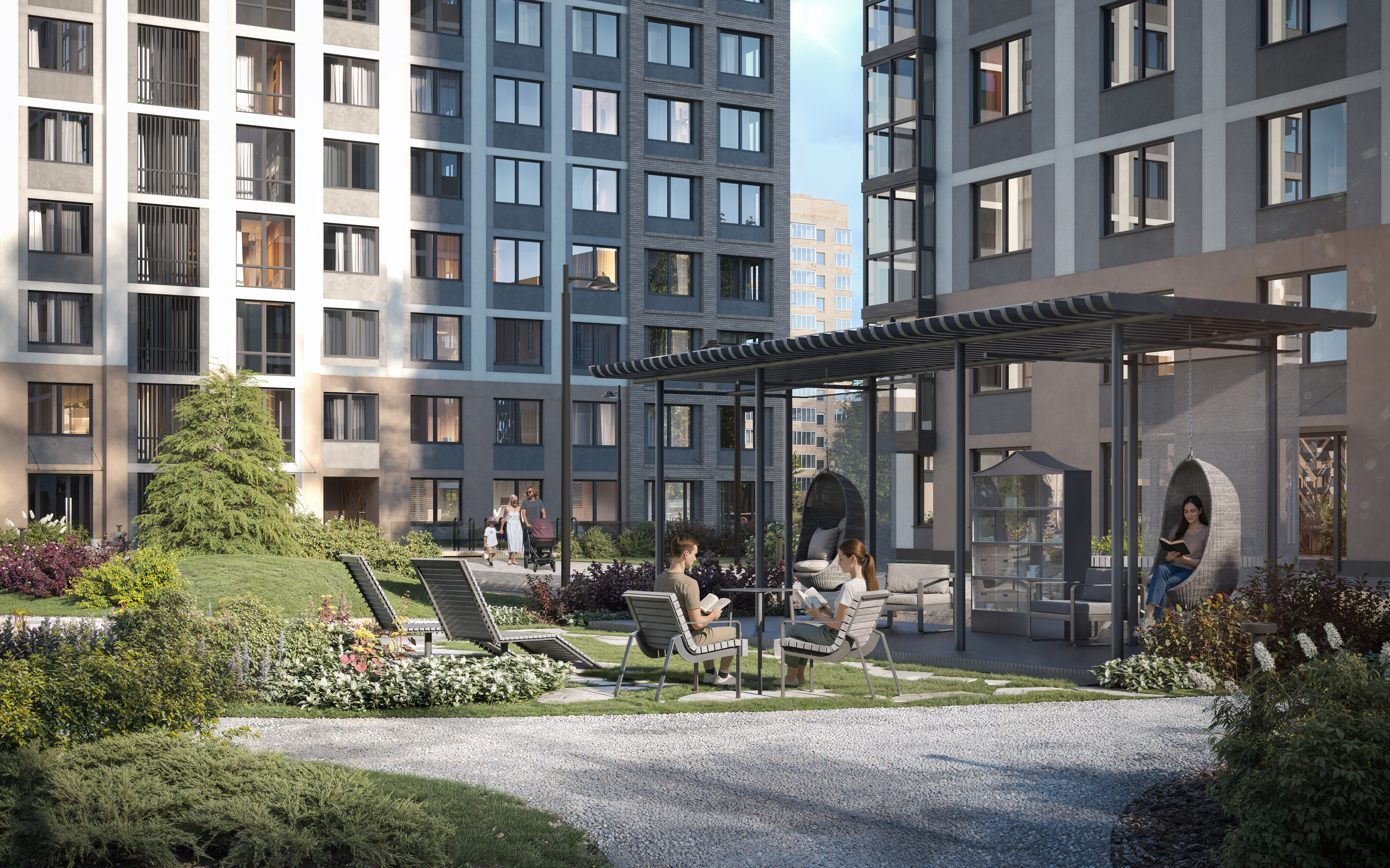 Во дворе «Гения» можно почитать книгу в библиотеке-беседке. Можно устроить пикник с семьёй в ресторанной зоне под навесами.
