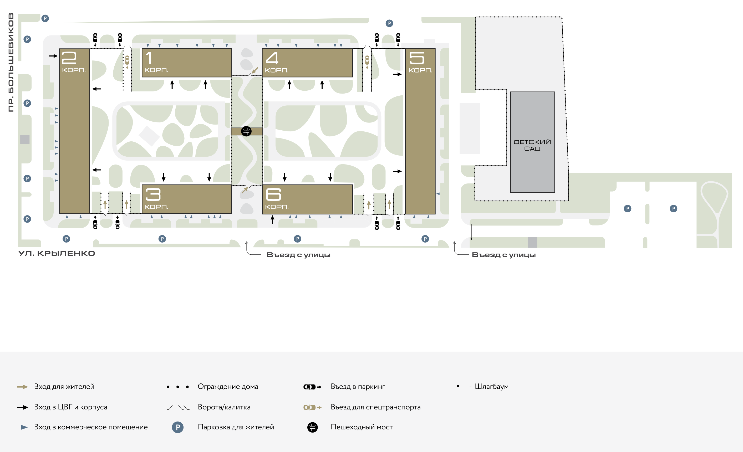 Территория полностью огорожена и охраняется круглосуточно, установлены камеры видеонаблюдения. Вход в парадные дома возможен только со стороны внутреннего двора. Подняться на приватную территорию и войти в парадные можно с помощью электронного ключа, но вынимать телефон или брелок из кармана не придется, так как доступ бесконтактный.